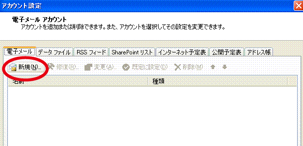 「電子メール」タブが選択されています。「新規」をクリックします。
