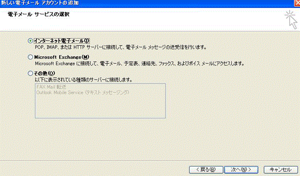 「電子メールサービスの選択」画面が表示されましたら「Exchange、POP3、IMAP、または HTTP』にチェックを入れ「次へ」を押します。