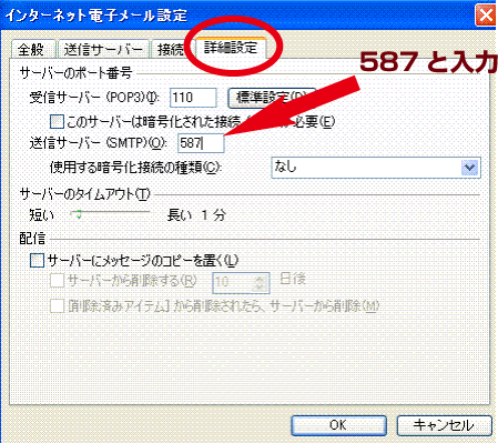 「詳細設定」タブをクリックし、「送信サーバー(SMTP)」に「587」と入力、「OK」ボタンを押します。