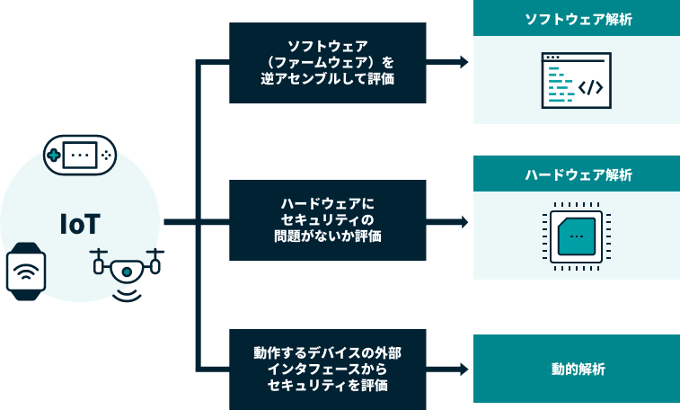 IoTデバイスにセキュリティ上の問題がないか「ソフトウェア解析」や「ハードウェア解析」を通じ、様々な観点から、そのセキュリティを評価します。