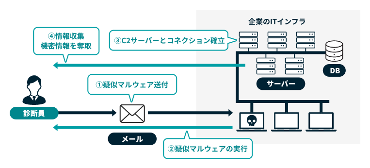 擬似マルウェアを実行いただき、感染端末から内部ネットワークに侵入し、個人情報等の重要な情報の奪取やサービスの停止が可能か調査します。