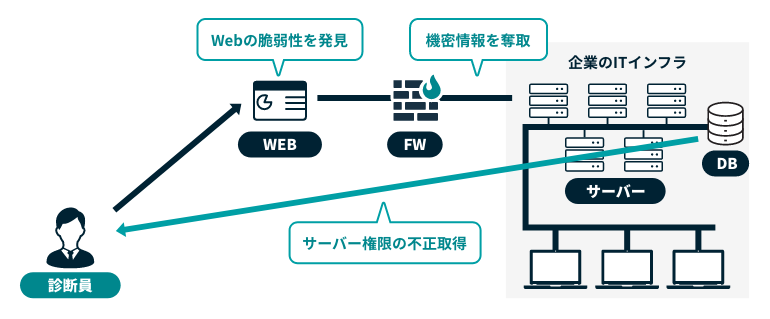 診断員が攻撃者と同じ視点のシナリオで侵入テストをし、脅威に対しての対策状況を評価します。