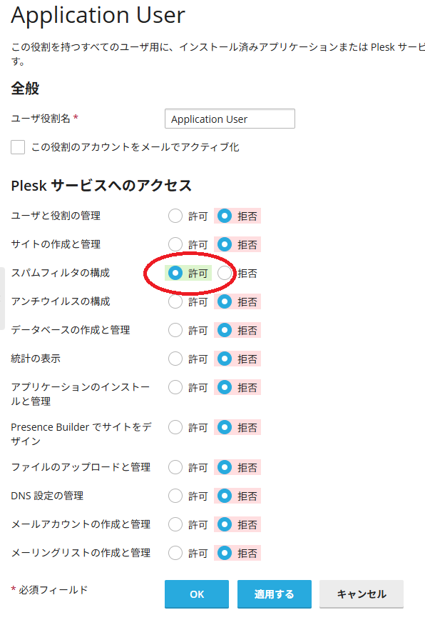 ※「スパムフィルタの構成」以外にも多くの権限設定がありますが、余計な権限を与えてしまうことになりますので、「スパムフィルタの構成」以外の権限は設定しないでください。