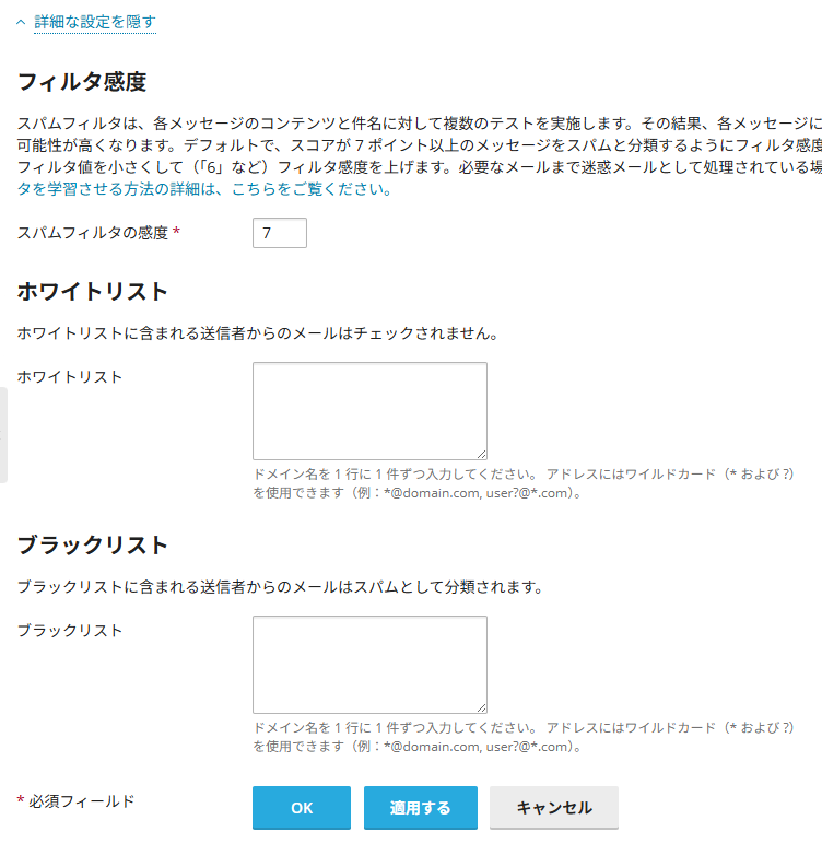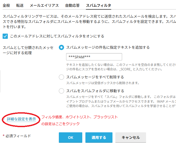(4) 開いたページで、スパムフィルタの設定変更ができます。