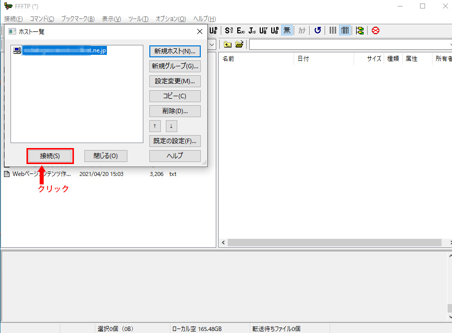 ホスト一覧に情報が追加されます。追加された行を選んで「接続」ボタンをクリックします。