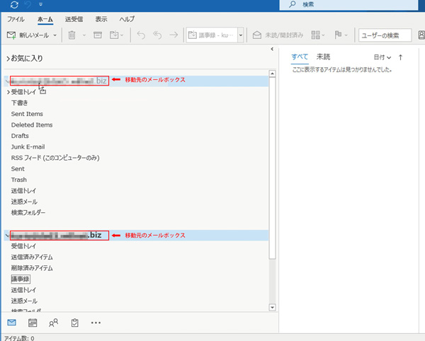 1.Outlookに移動元と移動先のメールボックスを作り、それぞれサーバーに接続します。