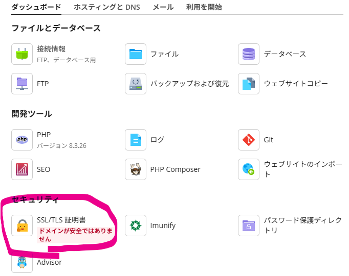 (1)「ウェブサイトとドメイン」の「ダッシュボード」タブで「SSL/TLS証明書」をクリック
