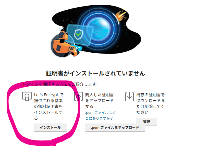 (2) まだ証明書を使っていない場合、Let’s, Encryptの「インストール」をクリック