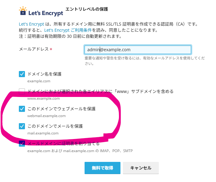 ※「このドメインでウェブメールを保護」もチェックすることをお勧めします(「webmail.独自ドメイン名」がDNSに設定されていること)。