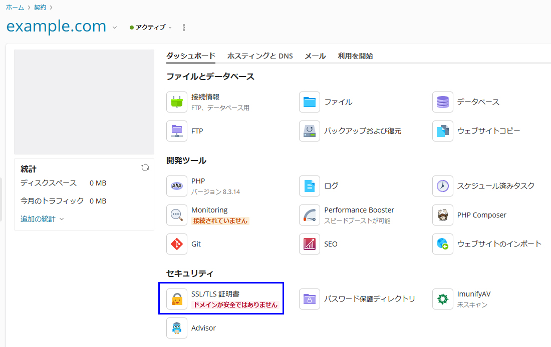 1.Pleskにログインして対象ドメインのダッシュボードを表示します。「セキュリティ」の箇所にある「SSL/TLS証明書」をクリックします。