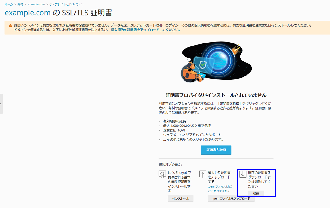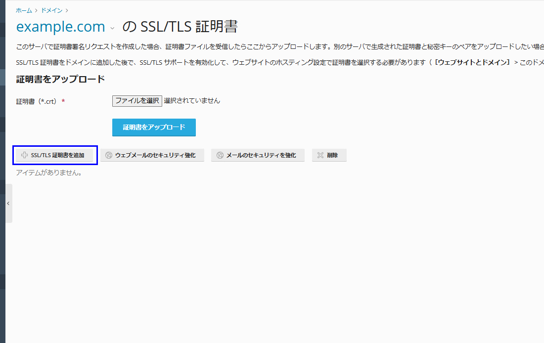 3.対象ドメインのSSL/TLS証明書の一覧が表示されます。「SSL/TLS証明書を追加」ボタンをクリックしてください。