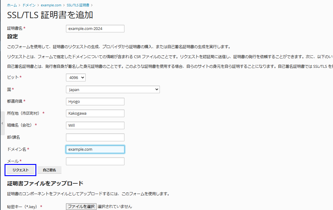 4.「設定」のところに国、県、市町村、組織名、取得するドメインのコモンネームをいれて「リクエスト」ボタンをクリックしてください
