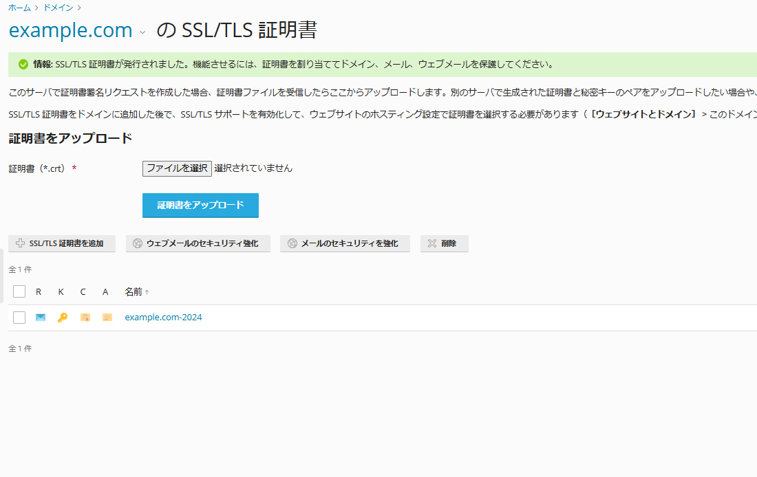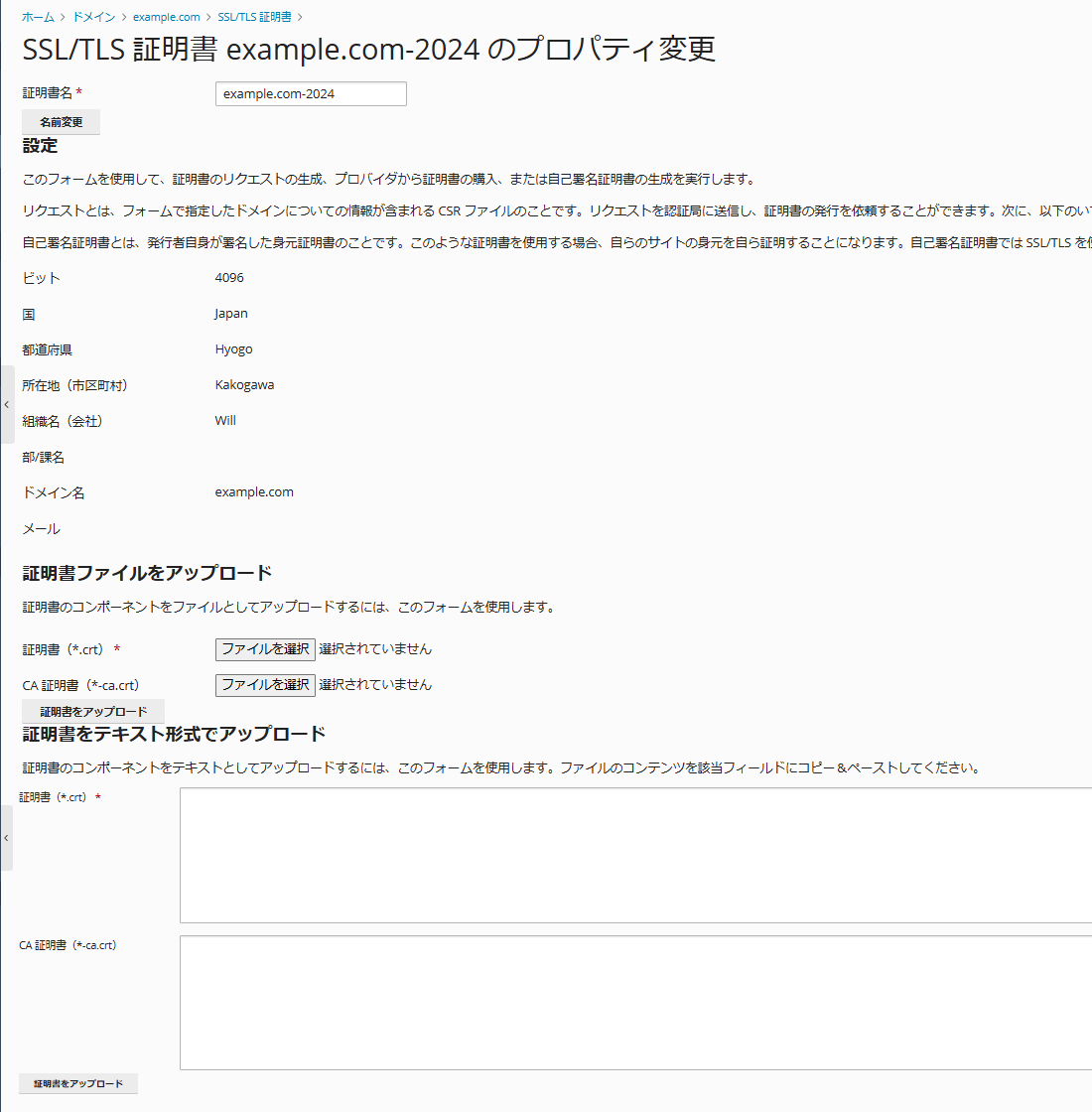 2.以下の画面が表示されます。「証明書ファイルをアップロード」の項目で入手したサーバー証明書のファイルをアップロードしてください