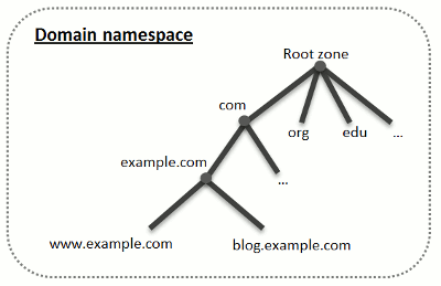 DNS のベースになるのは、「ドメイン名前空間」という階層状のツリー構造です。このグローバルな名前空間にはすべてのドメイン名が含まれており、「ドメインゾーン」と呼ばれる複数の論理パーツに分かれています(下図参照)。ドメインゾーンは名前空間の一部であり、複数のドメインのアドレスが含まれます。アドレスは、当該ゾーンに対して権限を持つネームサーバ上のファイルに保存されています。たとえば、ブラウザから www.example.com へのアクセスを試行すると、example.com ゾーンに対して権限を持つサーバからサイトの IP アドレスが通知されます。