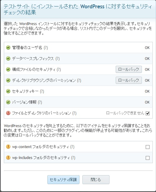 「セキュリティスキャン」では、以下の設定が施されているかチェックしています。また「セキュリティ保護」をクリックすると、これらのチェックが合格するように設定変更されます。