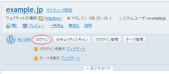 「ウエブサイトとドメイン」にWordPressの欄があられますので、「ログイン」をクリックします。