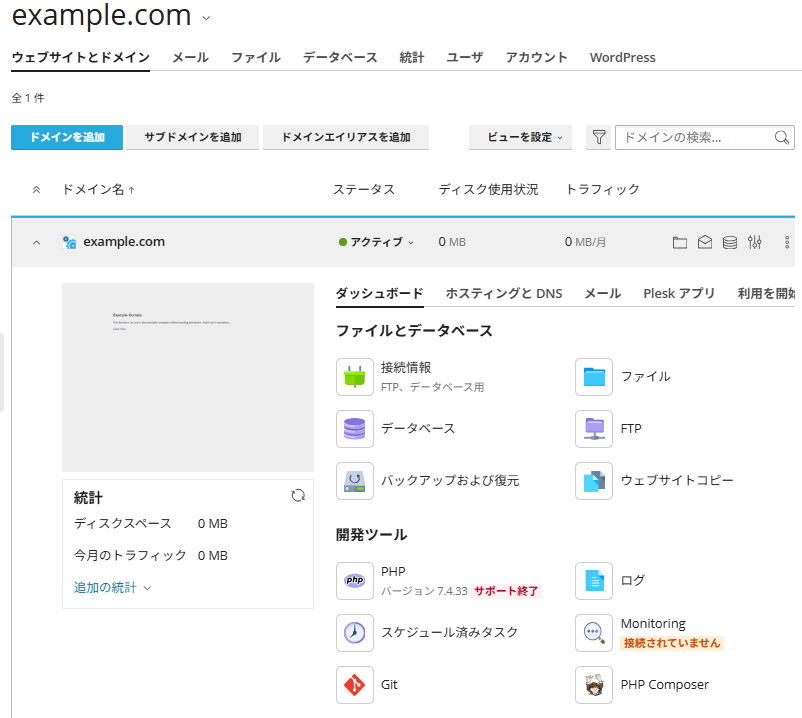 図1:Plesk「ウェブサイトとドメイン」を開く