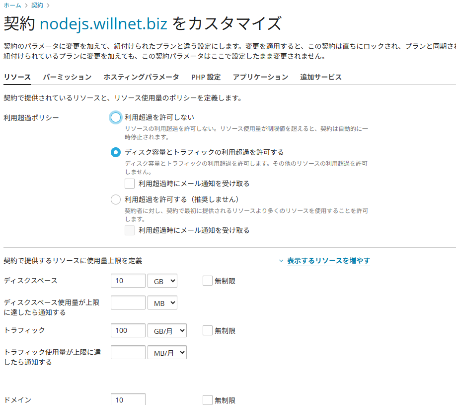 実際に使用できるリソースは、ここでの設定値か、ウイルネットの契約での値か、どちらかの小さい方になります。