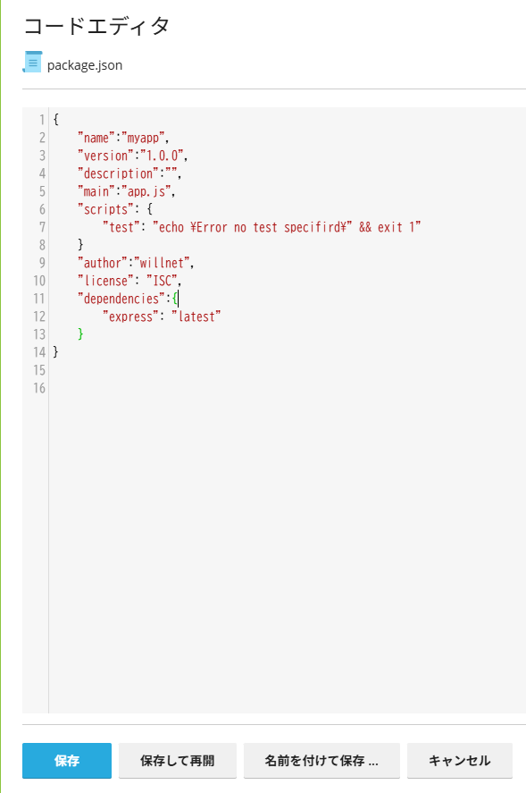 FTPでもPleskの「ファイルマネージャ」でもいいので、「アプリケーションルート」に package.json を以下の内容で作成します。ここでは「ファイルマネージャ」を使いました。