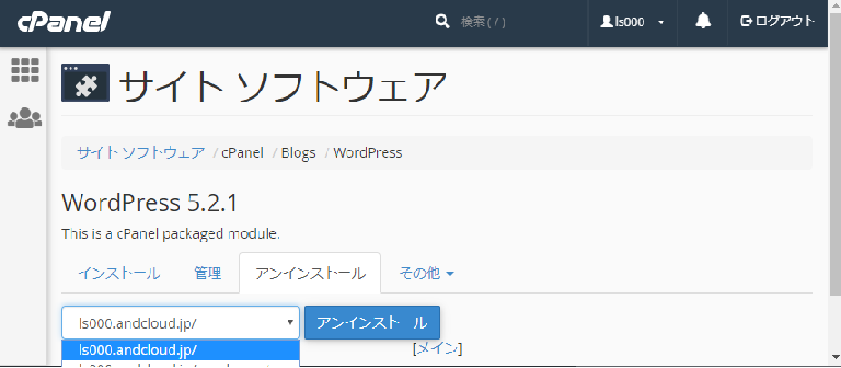 3.「アンインストール」タブをクリック、削除したいwordpressのサイトURLをプルダウンから選択し「アンインストール」をクリックします。